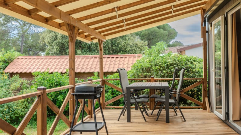 Extérieur Le mobil-home dispose d’une terrasse couverte, aménagée d’une table de jardin avec 4 chaises et 2 transats. Il y a un barbecue électrique à disposition. Vous pouvez garer une voiture à côté du mobil-home. Il n'est pas permis de recharger les voitures électriques ou hybrides sur le lieu d'hébergement. Des bornes de recharge électrique sont prévues à cet effet dans le parc.