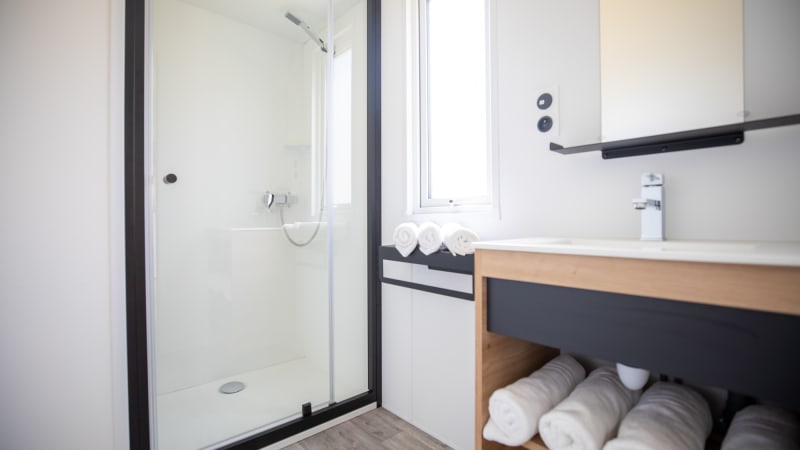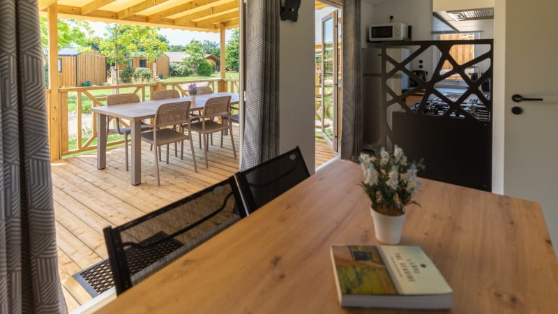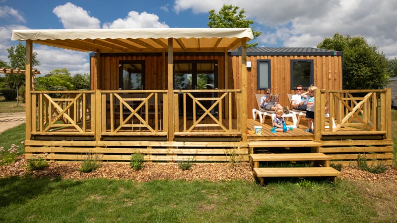 Extérieur Le mobil-home dispose d’une grande terrasse (23m²) semi couverte, aménagée d’une table de jardin, de chaises et de transats.