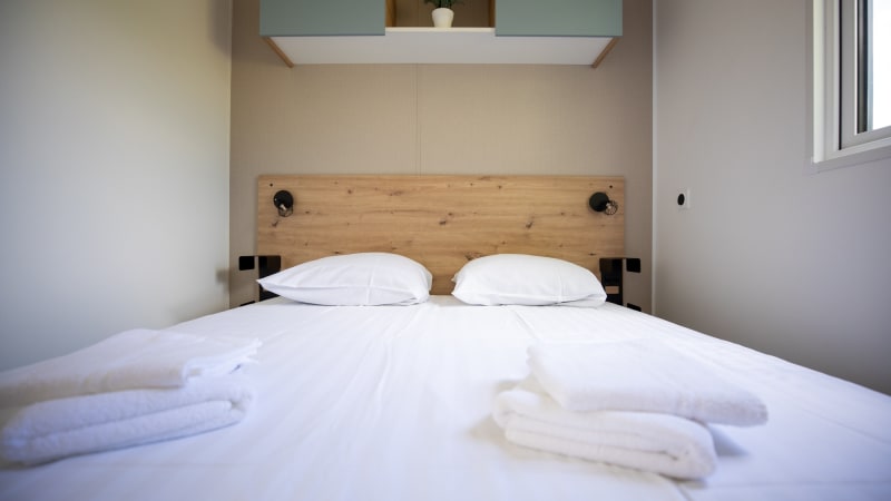 Chambre Le mobil-home dispose de trois chambres dont une chambre avec un lit deux personnes (160 x 200) et les deux autres chambres avec deux lits une personne (80 x 200).