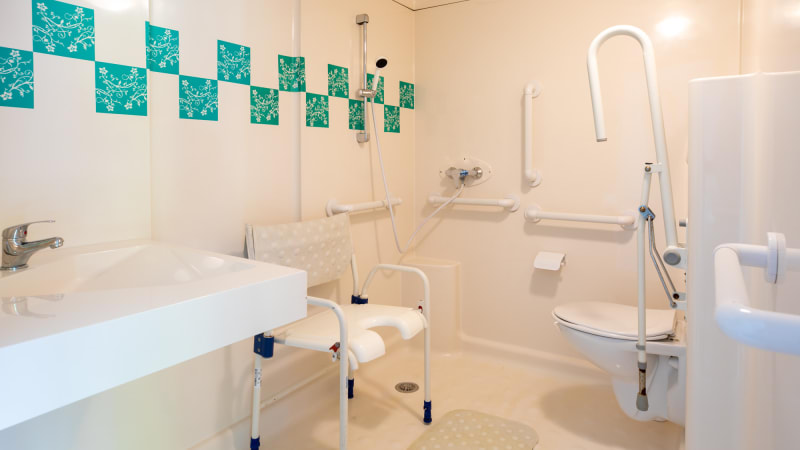 La salle de bains dispose d'une douche ouverte avec des barres de soutien et une chaise de douche, d'un WC surélevé avec barre de soutien, et le lavabo est à une hauteur adaptée.