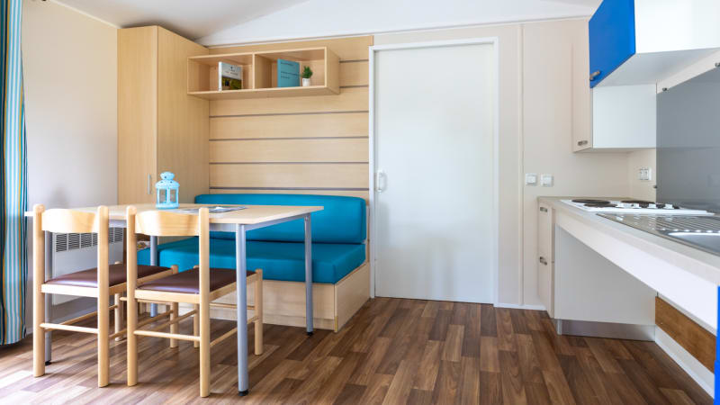 Dans le salon spacieux, vous pourrez vous détendre confortablement sur le canapé ou autour de la table à manger avec un banc et deux chaises. Le mobil-home est entièrement sans seuils, et toutes les pièces sont accessibles en fauteuil roulant.