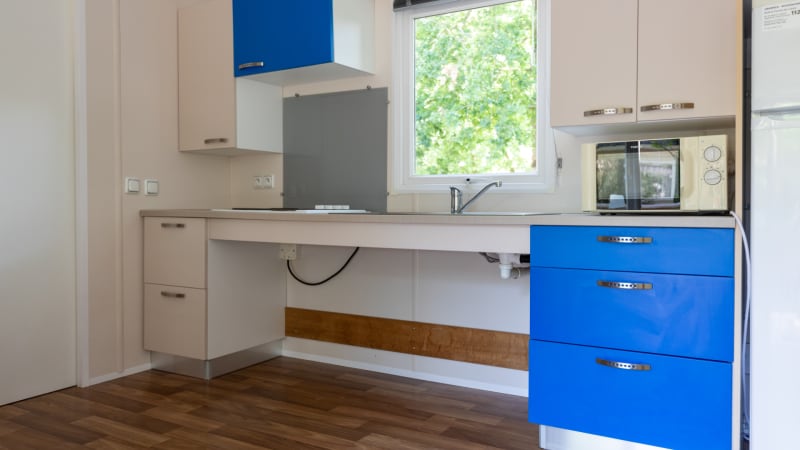 La cuisine est équipée d'un inventaire complet, d'un grand réfrigérateur avec congélateur, d'une plaque de cuisson électrique à 4 foyers, une cafetière Nespresso, d'une bouilloire et d'un micro-ondes classique. Le bas du plan de travail est ouvert pour permettre un accès facile en fauteuil roulant.