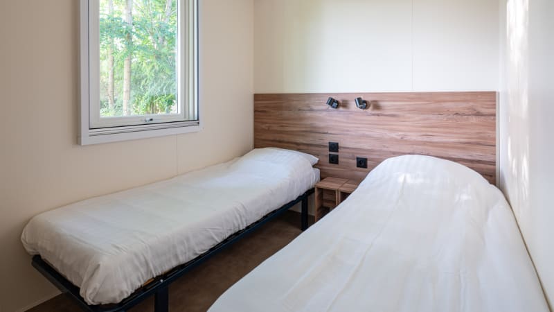Le mobil-home comprend trois chambres : une avec un lit double à sommier tapissier (160 x 200 cm), une avec deux lits simples (80 x 190 cm) et une avec un lit superposé avec deux lits simples (80 x 190 cm). Chaque lit est pourvu d'une couette simple. Il est possible de placer un lit de bébé, mais dans ce cas il faut enlever un autre lit.