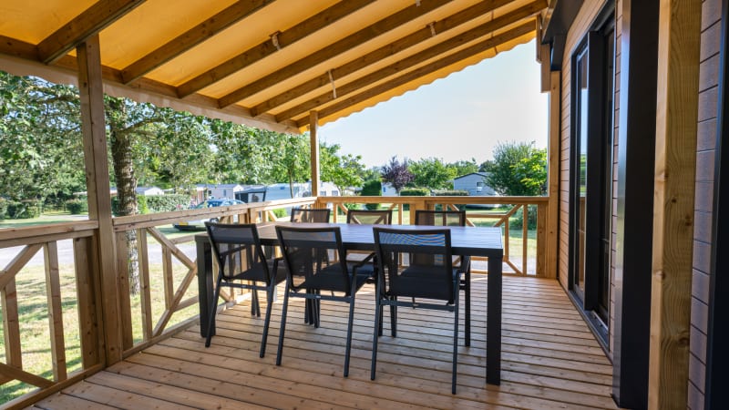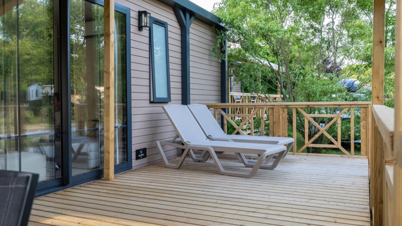 Le mobil-home dispose d’une très grande terrasse (27m²) semi couverte et surélevée. Vous pouvez alors confortablement vous installer à l’ombre ou au soleil. La très grande terrasse dispose d’une table de jardin avec six chaises et deux agréables transats. Vous pouvez garer une voiture près du mobil-home.