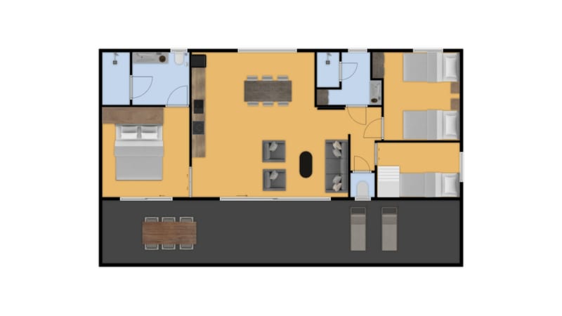Ce mobil-home dispose de deux grandes salles de bains. Une salle de bains est attenante à la chambre principale et comporte une douche, un lavabo, des toilettes et un sèche-cheveux. L'autre salle de bains est équipée d’une douche, d’un lavabo et d’un sèche-cheveux. Il y a aussi des toilettes séparées.