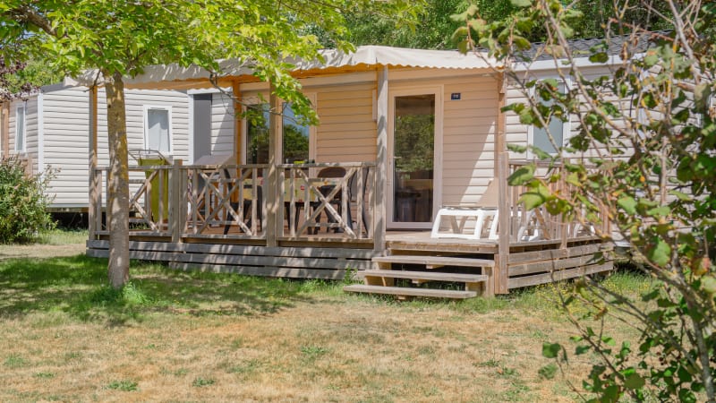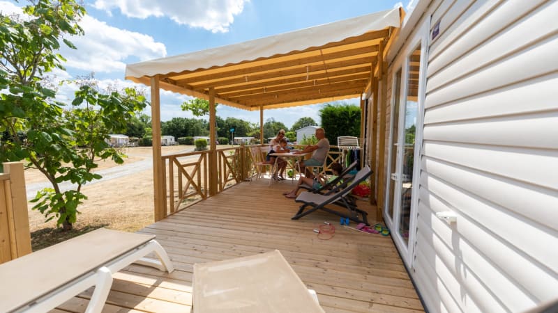 Extérieur Le mobil-home dispose d’une grande terrasse (21m²) semi couverte, aménagée d’une table de jardin, de chaises et de transats. Vous pouvez garer la voiture à côté du mobil-home.