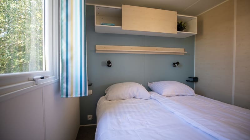 Chambre Le mobil-home dispose de trois chambres dont une chambre avec un lit deux personnes (160 x 200) et les deux autres chambres avec deux lits une personne (80 x 200).