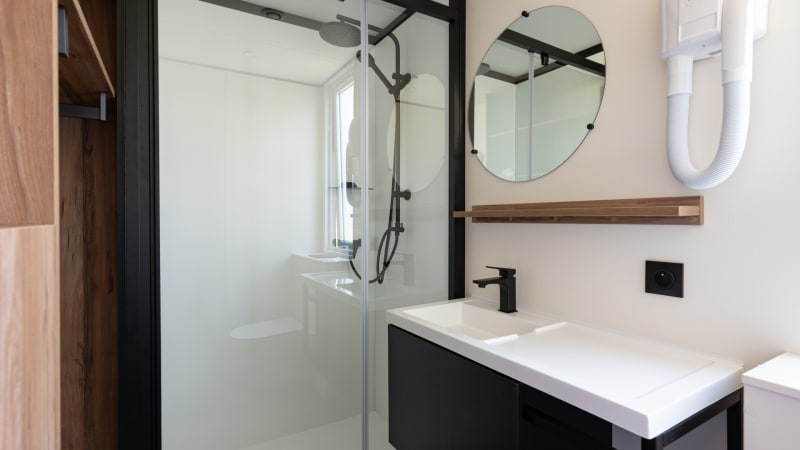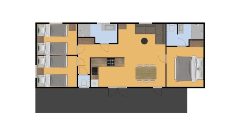 Le mobil-home dispose de trois chambres dont une chambre avec un lit deux personnes (160 x 200) et les deux autres chambres avec deux lits une personne (80 x 200).