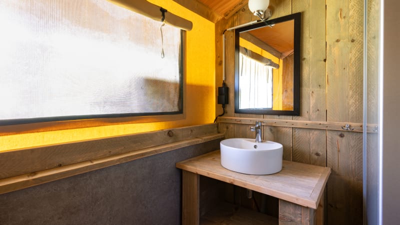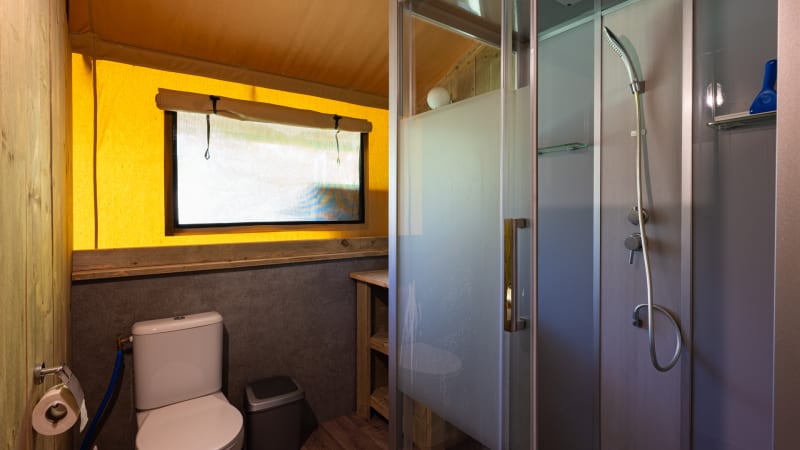 Salle de bains La tente Safari dispose d'une douche et de toilettes.