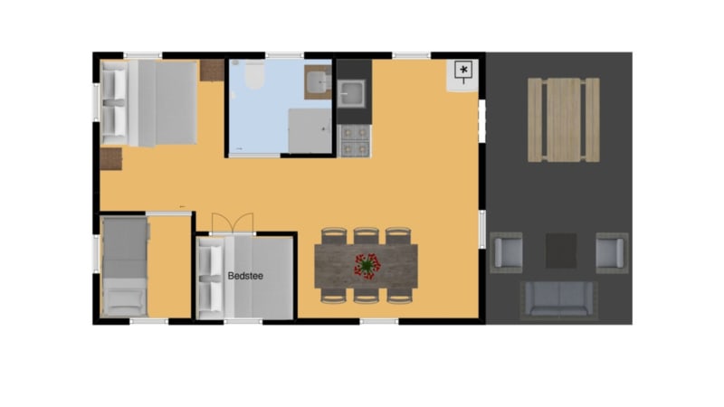 Extérieur Par beau temps, vous pourrez profiter d'un moment agréable à l'extérieur sur la terrasse équipée de mobilier de jardin et d'une table de pique-nique. Grâce à la grande couverture, vous pourrez également être à l'extérieur même par temps moins favorable. La tente est située dans la zone piétonne du camping. Vous pourrez garer votre voiture sur un parking à proximité.