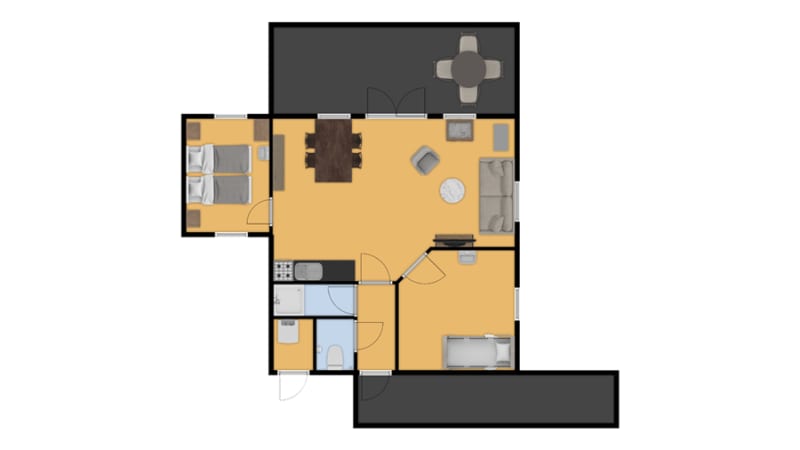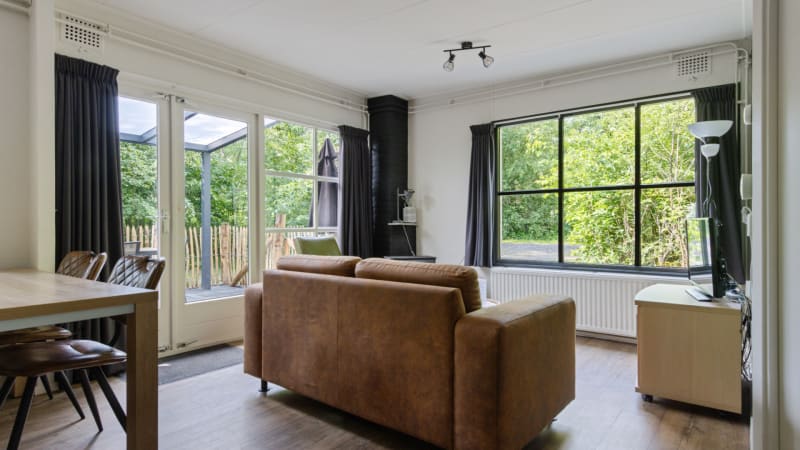Salon Ce mobil-home propose un coin salon confortable. Pour un peu plus de chaleur et de convivialité, vous pouvez allumer le poêle à bois, mais il y a aussi le chauffage central. Les portes-fenêtres du salon donnent directement sur la terrasse. Du mobilier pour enfants dans le bungalow est disponible sur demande.