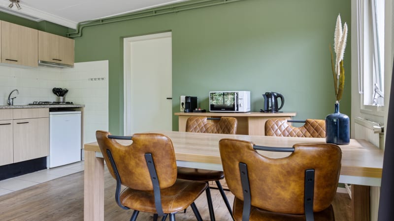 La cuisine ouverte de base dispose d'une plaque de cuisson à 4 feux (gaz), d'un réfrigérateur avec freezer, d'une cafetière à filtre et Nespresso, d'une bouilloire et d'un micro-ondes standard. Il y a un coin repas avec quatre chaises.