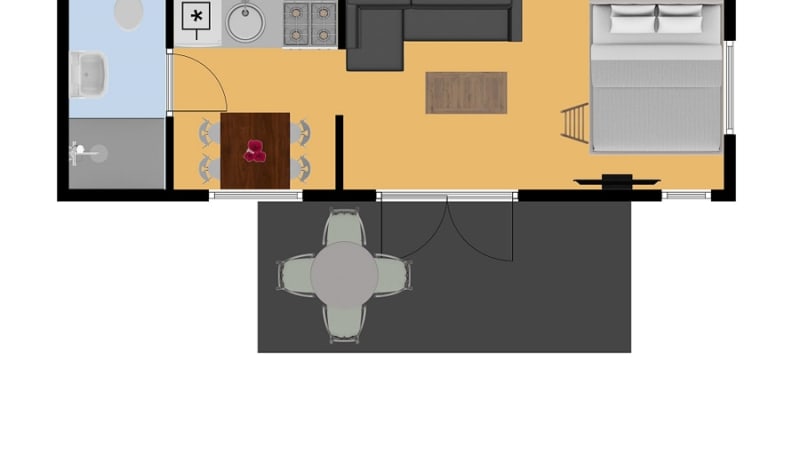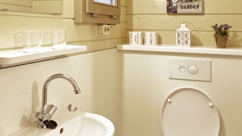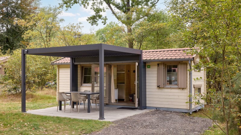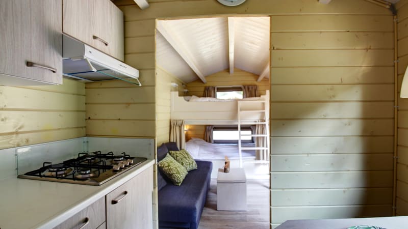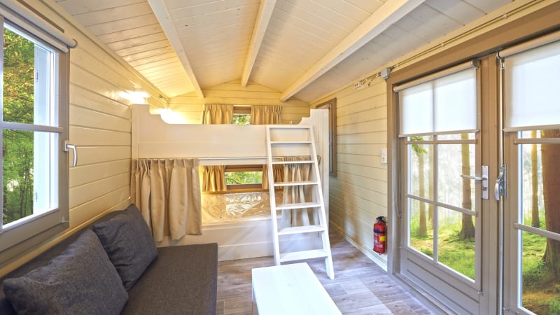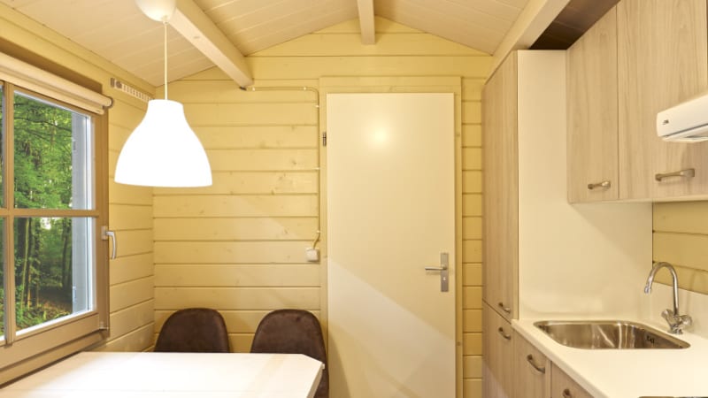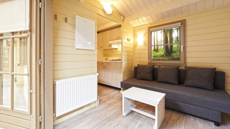 Le chalet est doté de portes coulissantes qui donnent accès à la terrasse et d’un confortable coin salon avec canapé. Tout est regroupé dans un seul espace, à l'exception de la salle de bains. Il y a un radiateur dans le chalet.