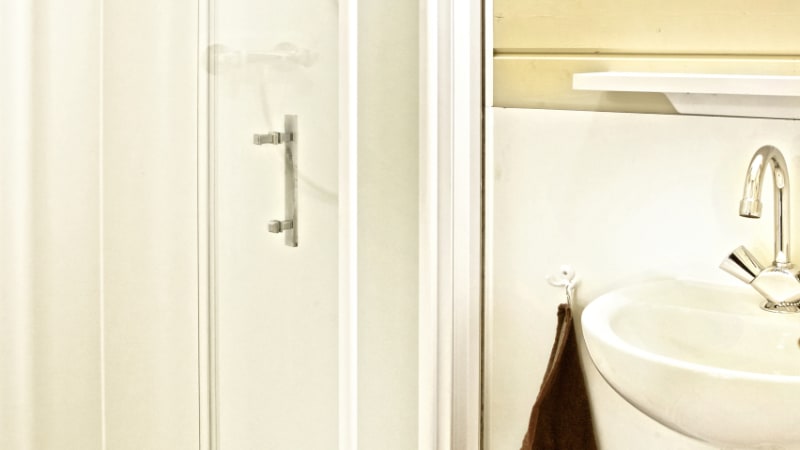 La salle de bains est équipée d’une cabine de douche, d’un lavabo et de toilettes.