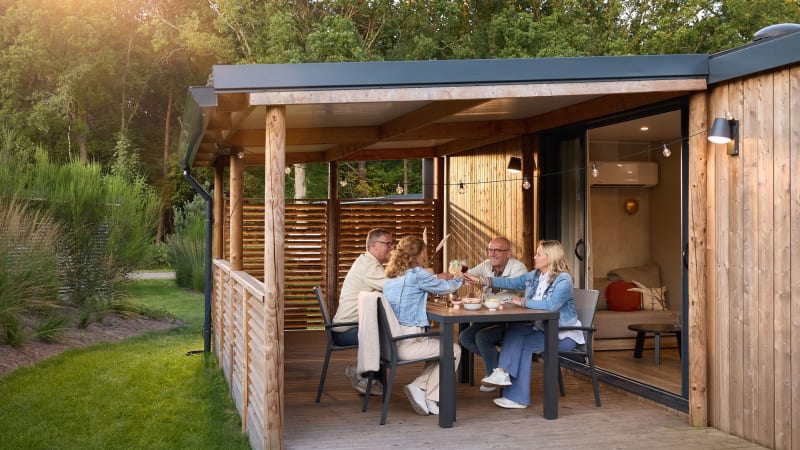 Extérieur Vous pouvez vous asseoir dehors rapidement grâce à la terrasse en bois avec auvent.