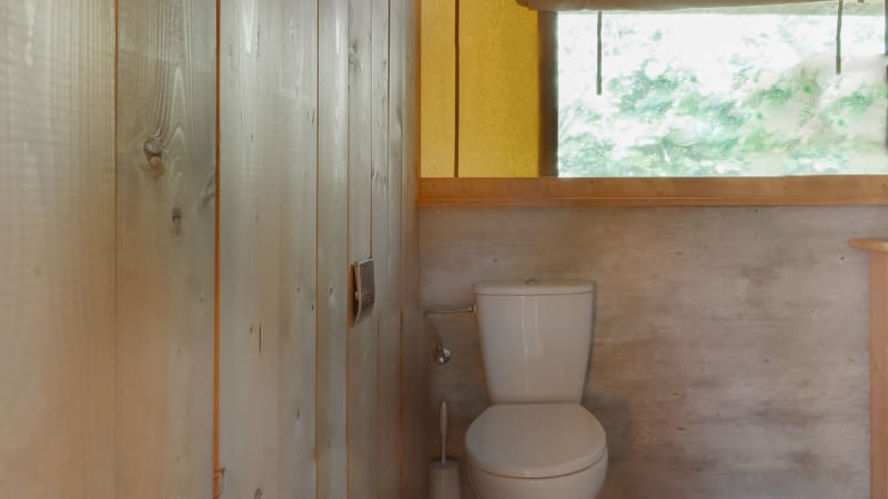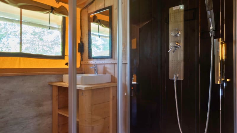 Salle de bain La tente safari dispose d'une salle de bain privative avec douche, toilettes et lavabo.