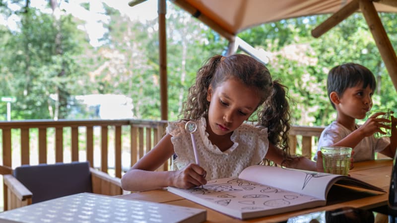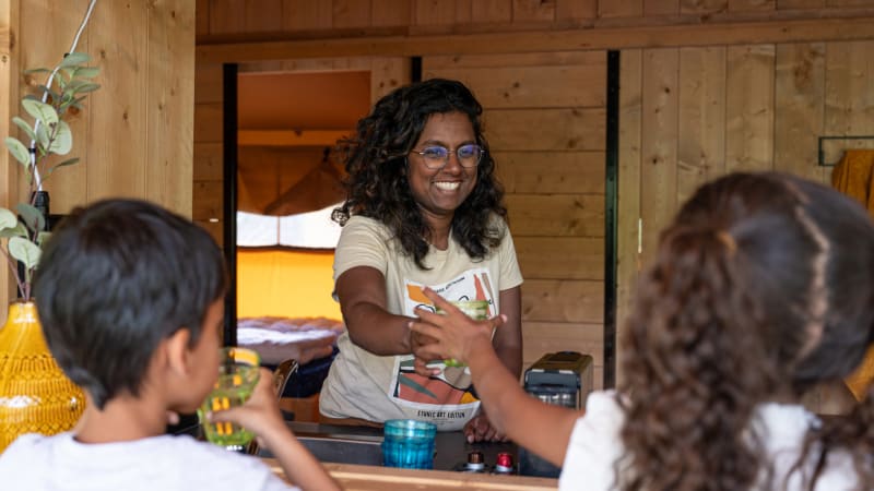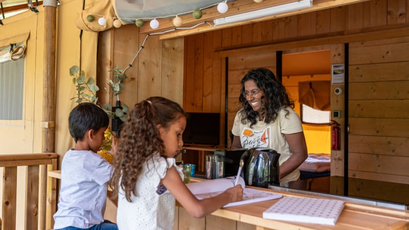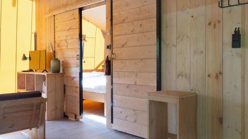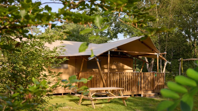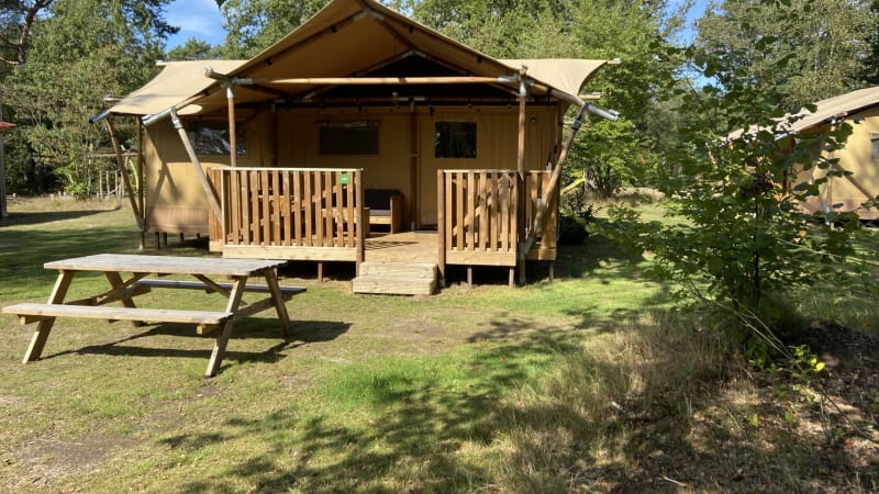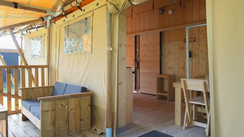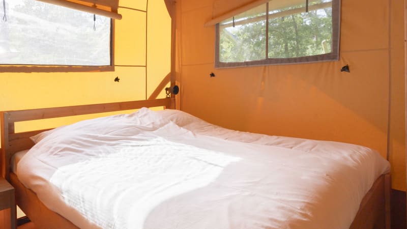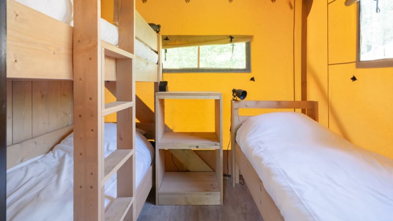 Dans la tente safari, il y a un lit double (200 x 160 cm), un lit simple (200 x 80 cm) et un lit superposé (200 x 80 cm). Les lits sont tous équipés d'oreillers et de couettes.