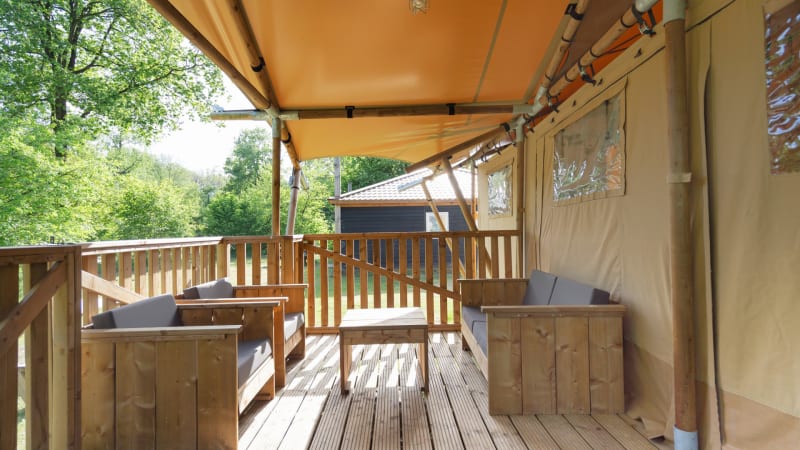 Le salon confortable est aménagé d'un coin salon avec un confortable canapé et d’une grande table à manger avec six chaises. Luxe supplémentaire : cette tente safari dispose d’un chauffage au sol.