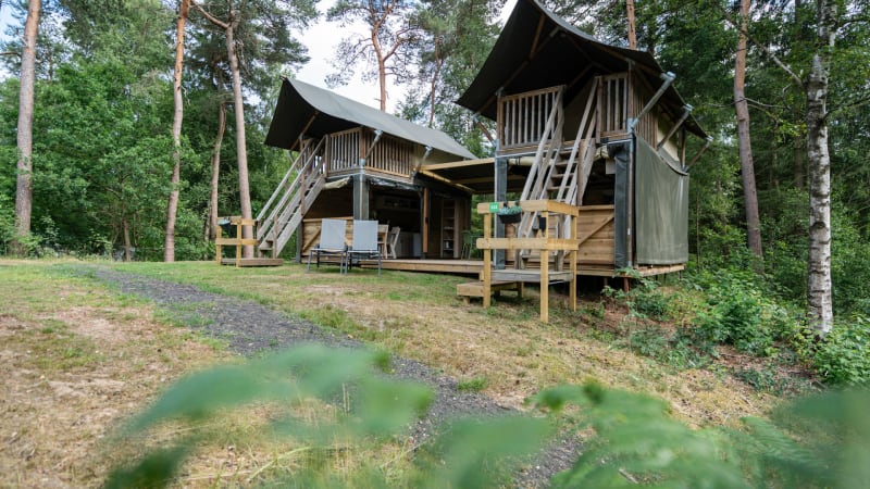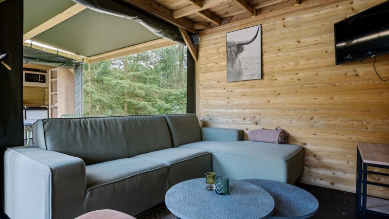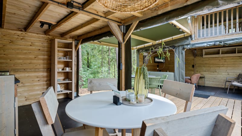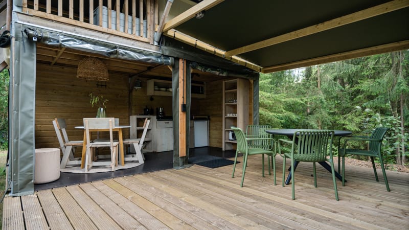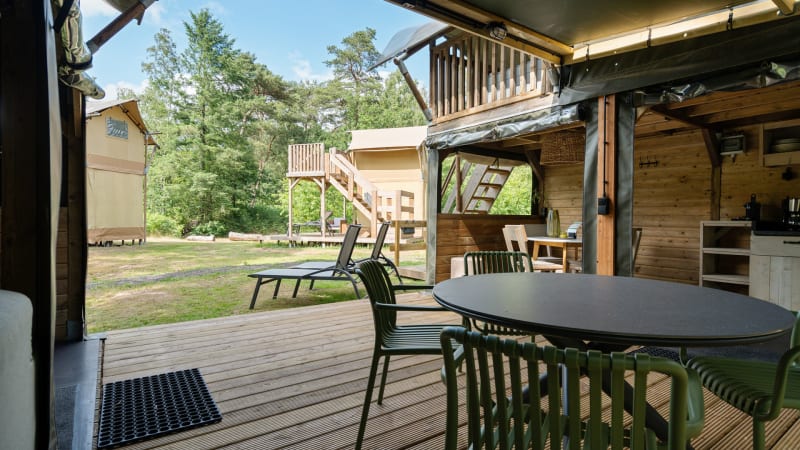 Près de la tente safari, vous avez toujours un endroit agréable pour vous asseoir. Savourez un repas à la table extérieure ou détendez-vous sur les chaises longues. La voiture peut être garée à proximité de la tente safari.