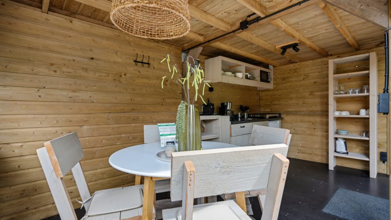 La tente safari dispose d'un coin cuisine avec eau froide et chaude, une plaque de cuisson à induction. Il y a également un réfrigérateur avec compartiment congélateur, un équipement de cuisine complet, une machine à café Nespresso et filtre, une bouilloire. Un coin repas confortable est présent.