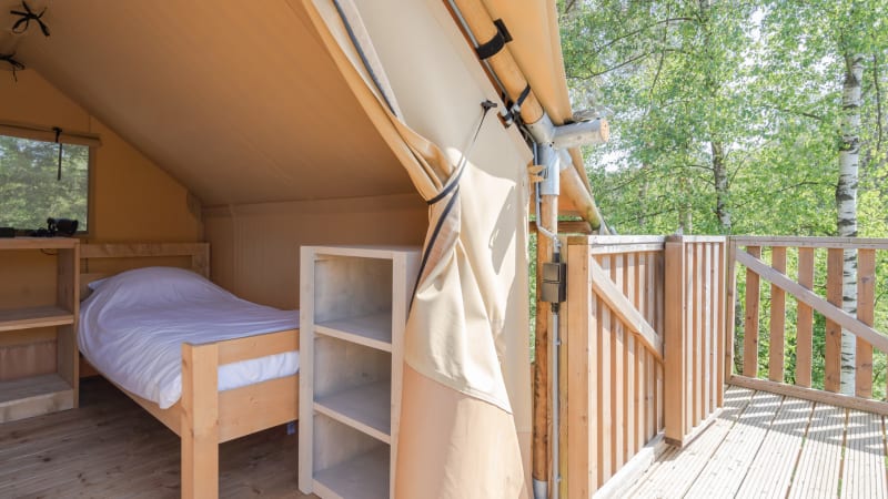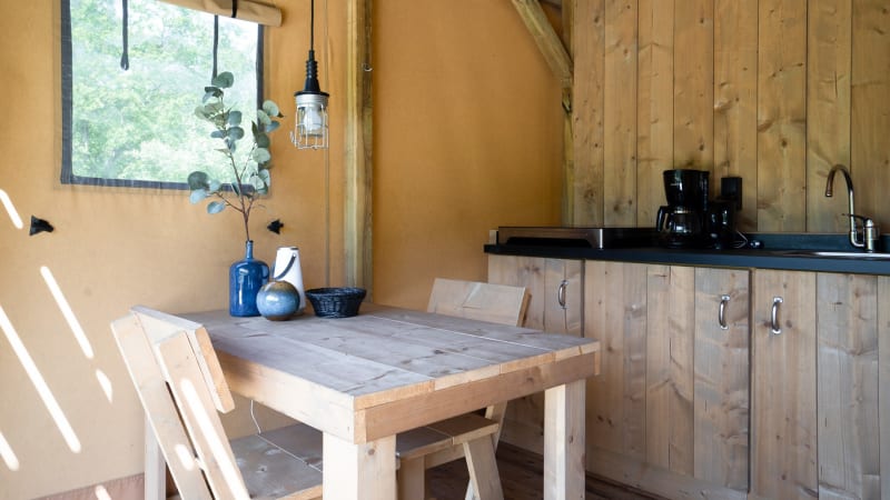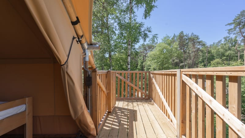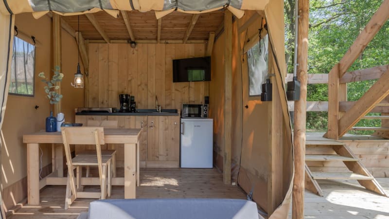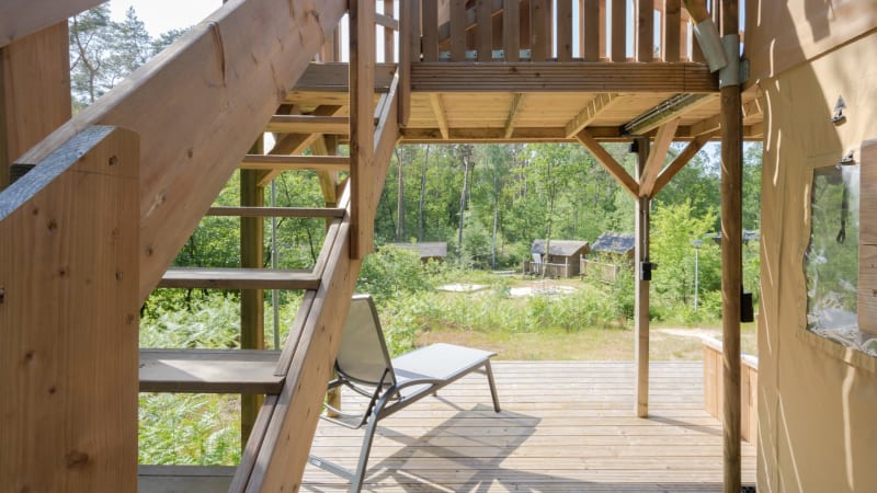 Extérieur Quand il fait beau, vous pouvez vous amuser dans cette tente safari ! Avec des espaces extérieurs à l'étage supérieur et inférieur, vous aurez toujours un endroit agréable où vous asseoir. Profitez de la véranda à l'étage supérieur ou au rez-de-chaussée avec un luxueux salon pour deux personnes.