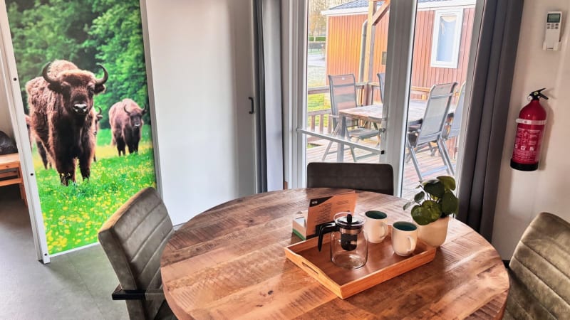 Extérieur Une terrasse en bois avec auvent vous permet de vous asseoir très vite dehors. Vous pouvez garer une voiture près du mobil-home.