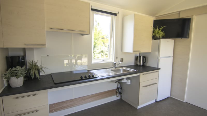 Le mobil-home pour quatre personnes comprend un coin cuisine avec plaque à induction 4 feux et hotte aspirante, réfrigérateur, four micro-ondes combiné, évier avec mitigeur, vaisselle et ustensiles de cuisine indispensables, cafetière à filtre, cafetière Nespresso et bouilloire.