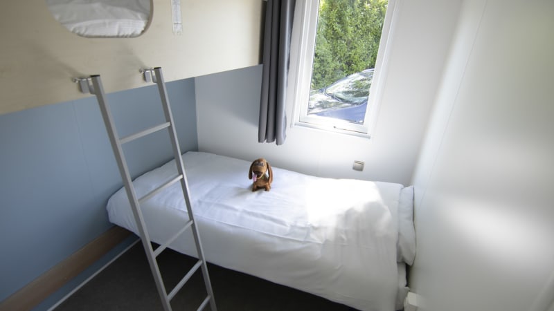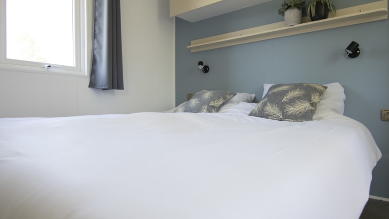 Le mobil-home dispose de deux chambres : une chambre avec un lit double de 1,60 m x 2 m et une chambre avec deux lits superposés perpendiculaires, un lit de 0,70 m x 1,90 et un lit de 0,90 m x 1,90 m. Le lit supérieur convient aux enfants à partir de 6 ans.