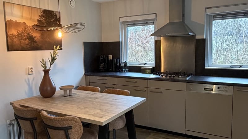 Le bungalow dispose d'une cuisine ouverte avec une plaque de cuisson à gaz 4 feux, un réfrigérateur avec compartiment congélateur, une cafetière filtre, une machine Nespresso, un lave-vaisselle et un four micro-ondes combiné. Le coin repas peut accueillir quatre personnes.