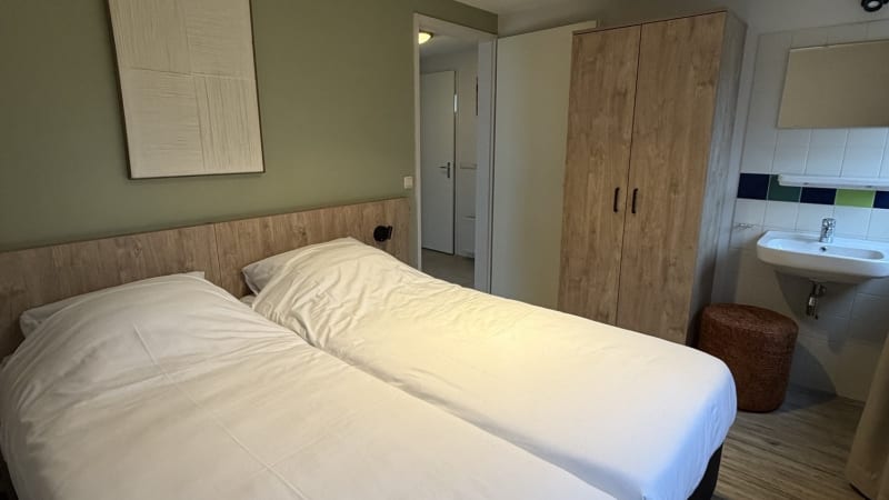 Il y a deux chambres, chacune avec deux lits boxspring confortables de 0,80 sur 2 mètres. Chaque lit dispose d'une couette individuelle. La plus grande chambre a sa propre télévision. Il est possible d'ajouter un lit bébé.