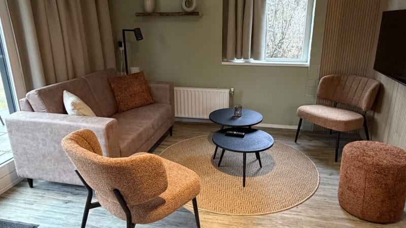 Un coin salon confortable est aménagé avec un canapé, deux fauteuils et une télévision à écran plat. Pour plus de chaleur, vous pouvez allumer le poêle à bois, mais il y a aussi le chauffage central.