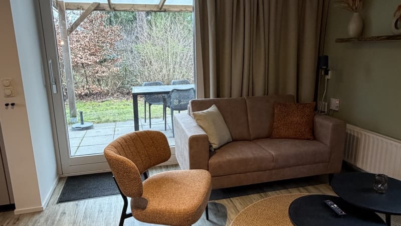 Extérieur Depuis le salon, vous avez un accès direct à la terrasse par la porte coulissante. La spacieuse terrasse est orientée au sud et dispose d'un auvent pour que vous puissiez profiter de l'extérieur même par temps moins clément. Vous pourrez même profiter du soleil dès le début du printemps. Vous pouvez garer votre voiture près du bungalow.