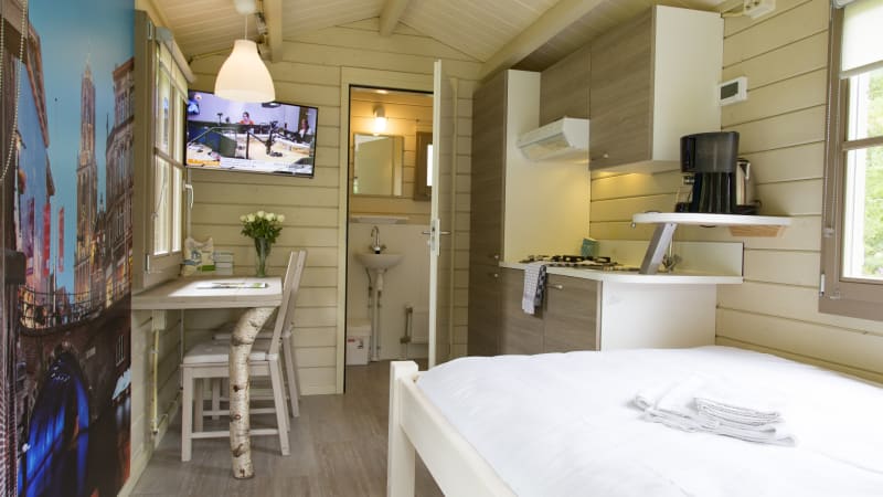 Ce chalet de camping est équipé d’un petit bloc cuisine avec plaque de cuisson à 2 feux et hotte aspirante. réfrigérateur, évier avec robinet mitigeur, inventaire cuisine, cafetière et bouilloire, et un téléviseur à écran plat.