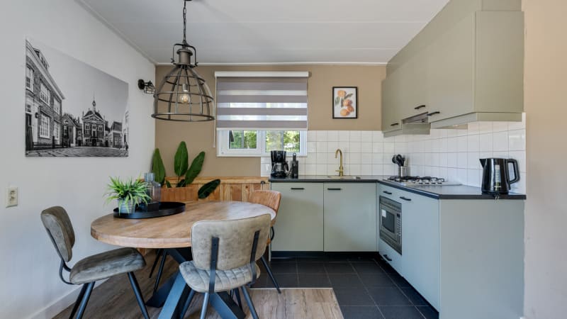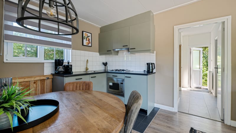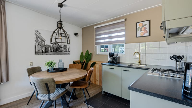 Le bungalow dispose d’un coin cuisine ouvert avec une plaque de cuisson 4 feux (à gaz), un réfrigérateur avec congélateur, une cafetière à filtre et une machine Nespresso, un lave-vaisselle et un micro-ondes combiné. Le coin repas peut accueillir 4 personnes maximum.