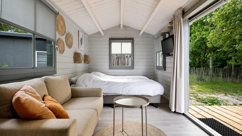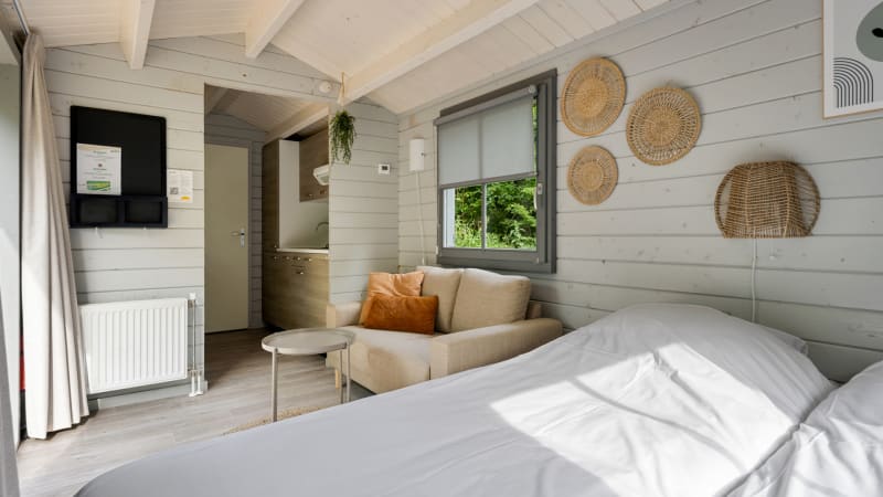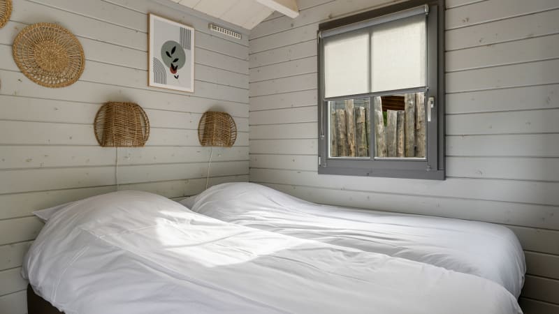 Chambre Le chalet de camping dispose d'un lit double de 160x200 cm avec couettes et oreillers simples. Ce lit est situé à côté du coin salon.