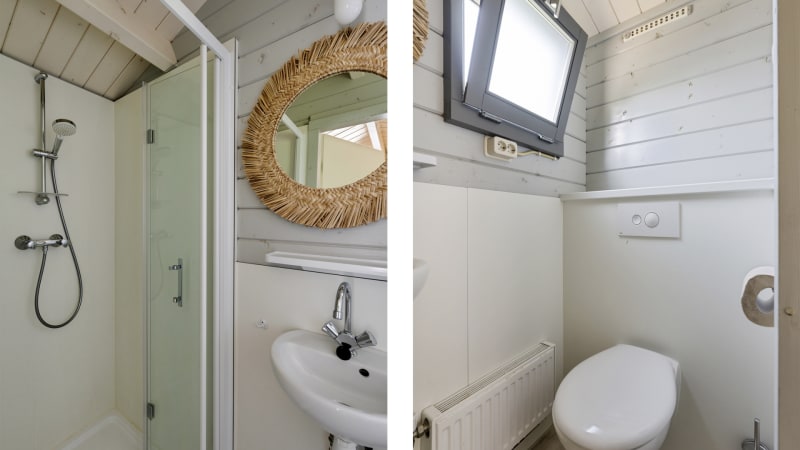 Salle de bains La salle de bains est équipée d'une cabine de douche, d'un lavabo et de toilettes. Il y a également un radiateur pour les jours plus froids.