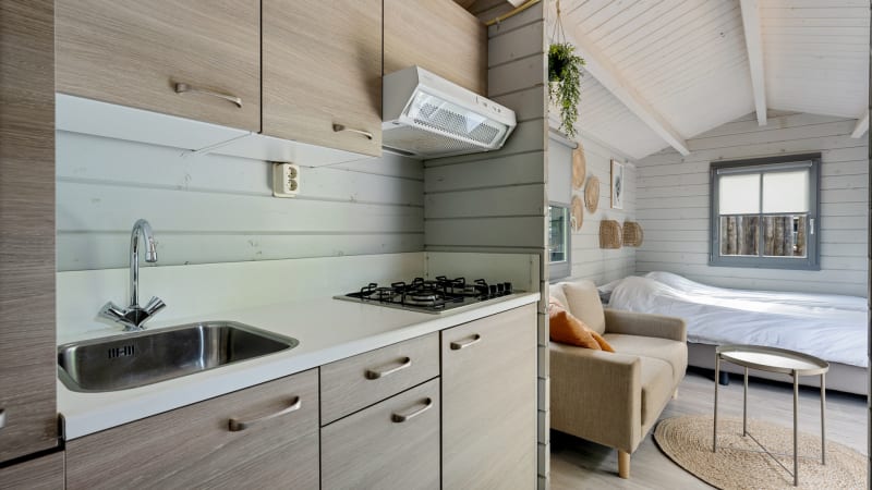 Cuisine Cet hébergement de camping dispose d'une kitchenette entièrement équipée avec une cuisinière à 4 feux, de l'eau chaude et froide, une hotte aspirante, un réfrigérateur et une cafetière. Le coin repas peut accueillir 2 à 3 personnes.