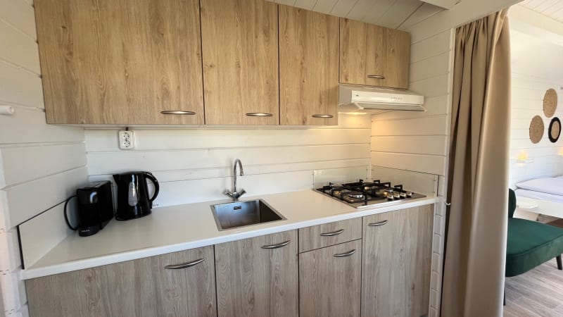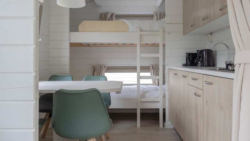 La sensation du camping, mais le confort d’une maisonnette ! Des vacances en vélo, des vacances à la plage ou tout simplement quelque chose d’autre ? Situé sur un agréable terrain de camping touristique, à proximité de toutes les commodités du parc et à deux pas de la plage, ce chalet de camping est une réelle expérience pour quatre personnes ! Cuisine Ce chalet de camping est équipé d'un bloc cuisine entièrement équipé avec plaque de cuisson 4 feux, eau courante chaude et froide, hotte aspirante, réfrigérateur et cafetière. Le coin-repas peut accueillir quatre personnes.