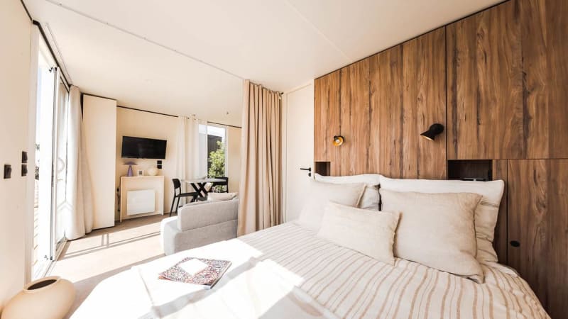Chambre Le chalet-hôtel ne dispose pas de chambre séparée, mais le séjour et l’espace nuit sont séparés par un rideau tendance. Tu dors sur un confortable lit boxspring d’hôtel (lit double 160x200 cm) avec un accès direct à la salle de bains. Il y a suffisamment d’espace de rangement.