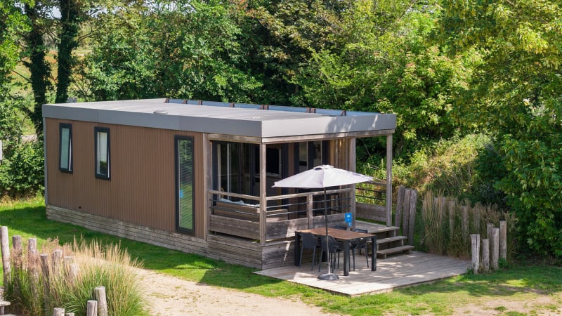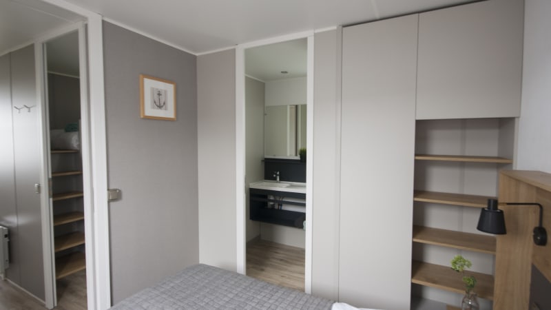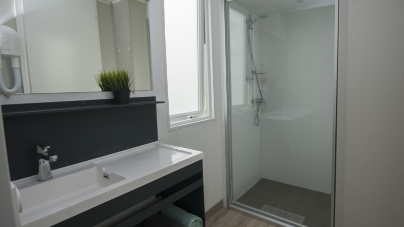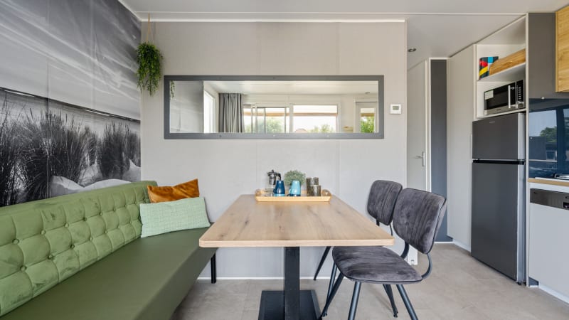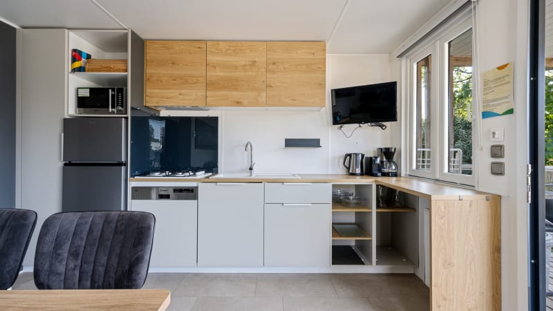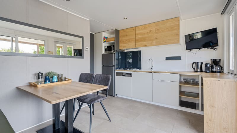 Ce mobil-home tendance pouvant accueillir 4 personnes maximum comprend une cuisine ouverte moderne, une douche et des toilettes séparées, et deux chambres. Le petit salon douillet est doté d'un coin repas et salon convivial (2 en 1) et d'une télévision à écran LED. La cuisine est équipée de façon standard avec une plaque de cuisson 4 feux (gaz), un combiné four/ micro-ondes, un grand réfrigérateur avec freezer, un lave-vaisselle, une cafetière, une bouilloire, et vaisselle et ustensiles de cuisine. Ce mobil-home comprend aussi un coin salon/salle à manger très convivial ainsi que le chauffage central.