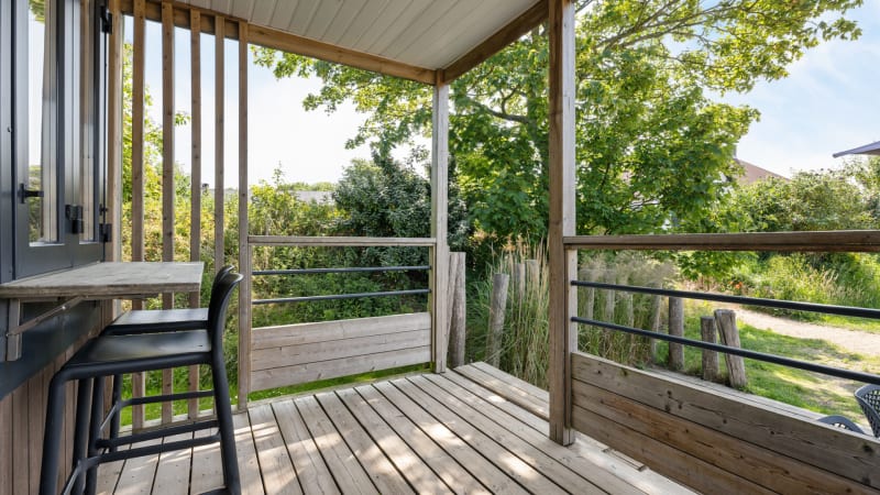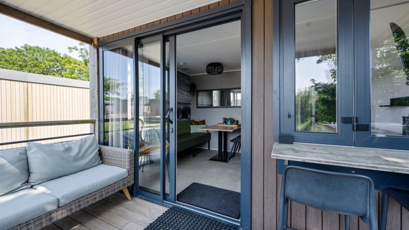 La baie vitrée ouvre sur la véranda couverte (+/- 8 m2) aménagée d'un canapé et d'un agréable petit bar avec 2 tabourets. Ce mobil-home dispose non seulement d'un auvent mais également d'une terrasse en bois avec une table et des chaises de jardin, pour prendre un verre ou dîner au soleil quand il fait beau!