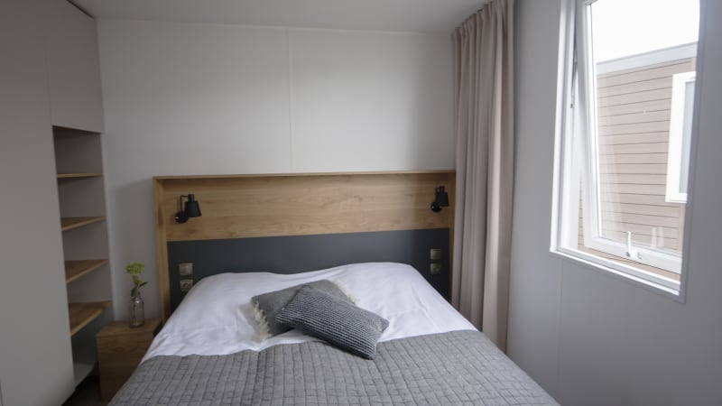 La chambre parentale est dotée d'un lit deux personnes de 160 x 200, de nombreux rangements et dispose d'un accès direct à la salle de bains. La 2e chambre est idéale pour des enfants. Cette chambre est équipée d'un lit mezzanine et d'un lit bas (chacun de 80 x 190, superposés en perpendiculaire) et d'espace de rangement. Il est possible d'ajouter 1 lit de camping/lit de bébé dans cette chambre. Cette chambre a un accès direct à la salle de bains. Il peut y avoir max. 1 personne supplémentaire à dormir sur le canapé-lit dans le salon.