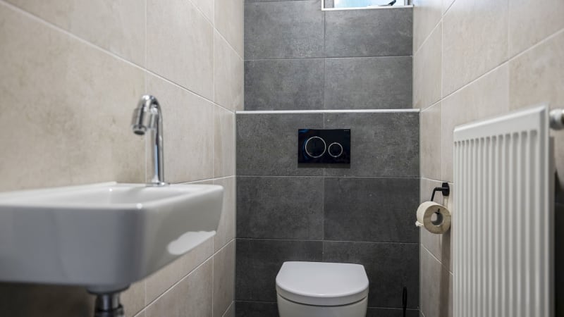 Le bungalow dispose d'une grande salle de bains luxueuse avec une baignoire, une douche séparée et des toilettes. Il y a un second WC séparé.