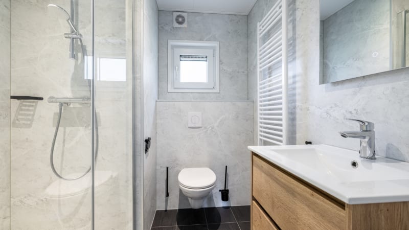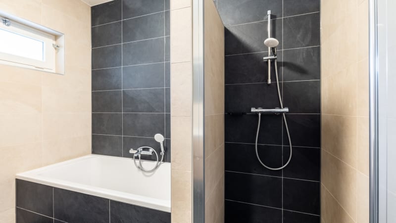 Salle de bains Il y a trois salles de bains et un WC séparé. Une salle de bains avec baignoire se trouve dans le bungalow, tandis que les deux autres salles de bains sont dans l'hébergement séparé à l'extérieur, attenant à la chambre.