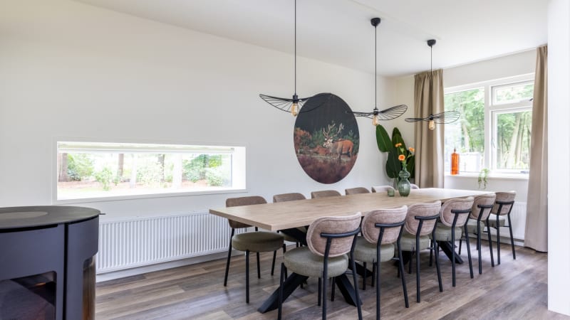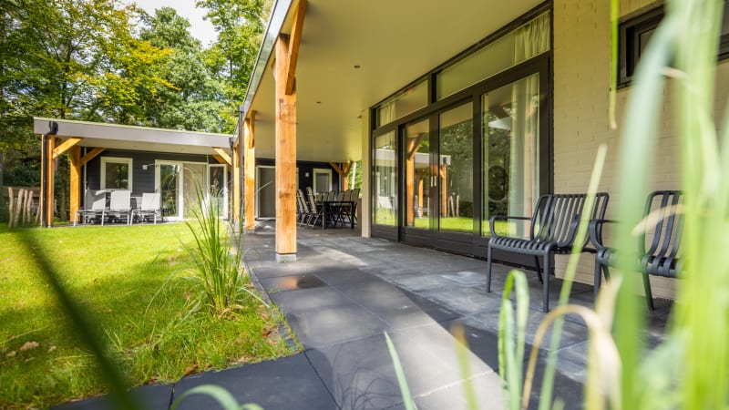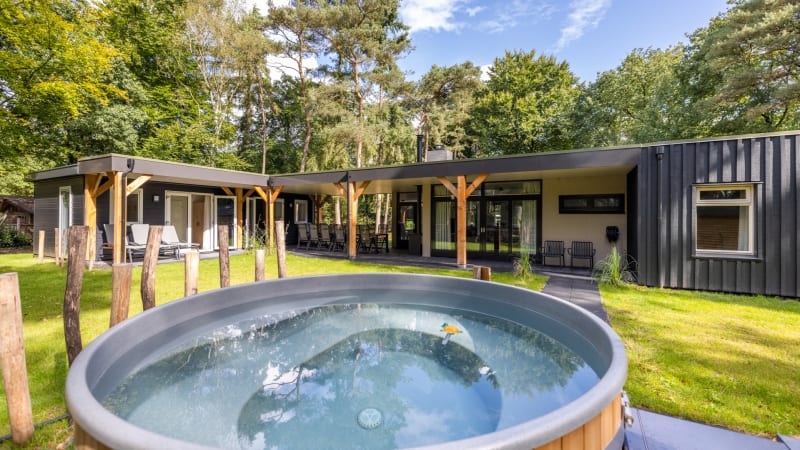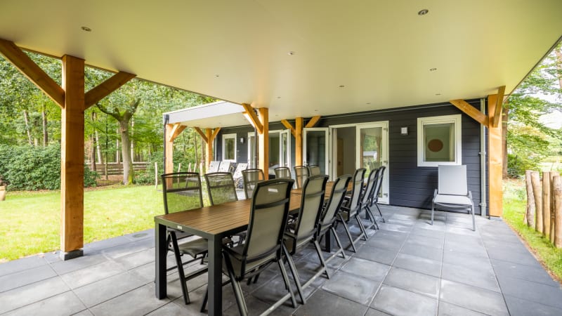 Extérieur Profitez de l'air frais sur la terrasse couverte avec un coin repas pour 12 personnes. Sur la terrasse, il y a un poêle à bois chaleureux pour profiter de la tranquillité de la nature en bonne compagnie. De plus, un jacuzzi est disponible à l'extérieur.
