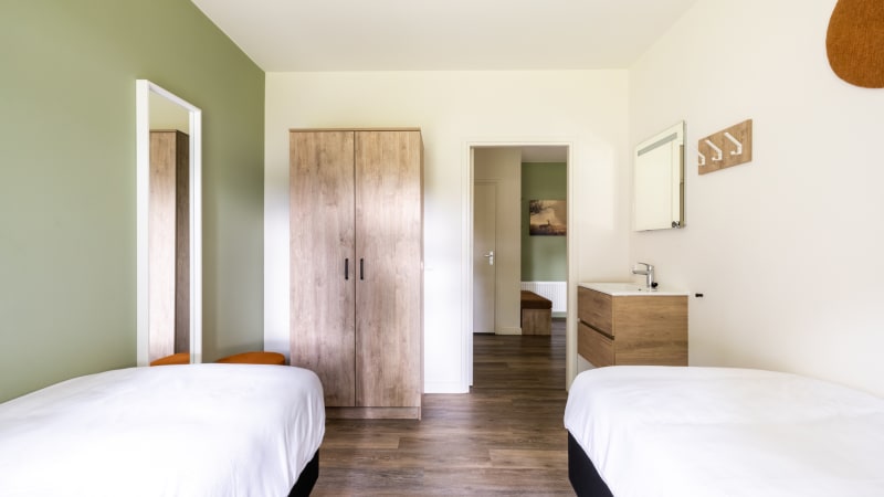 Chambres Le bungalow familial comprend six chambres : quatre avec des lits boxspring et deux avec des lits simples séparés.