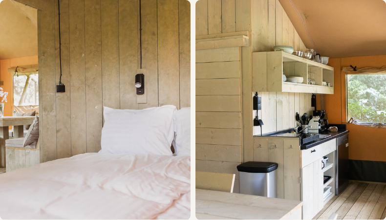 Een safaritent is allesbehalve een gewone tent. Ruim, gezellig en compleet ingericht, zodat je je meteen thuis voelt. Denk aan fijne bedden, een praktische keuken en een gezellige zithoek voor een spelletje of een goed gesprek ’s avonds. Zo geniet je volop van het buitenleven, maar dan wél met het gemak van thuis. Sommige tenten hebben zelfs privé sanitair.