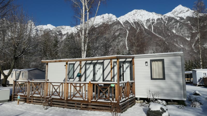 Een luxe en ruim chalet voorzien van alle gemakken op onze mooie wintercamping in de Franse Alpen.