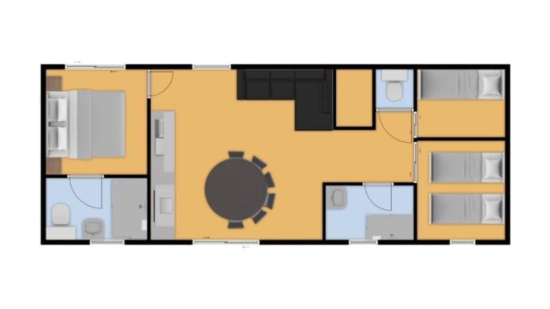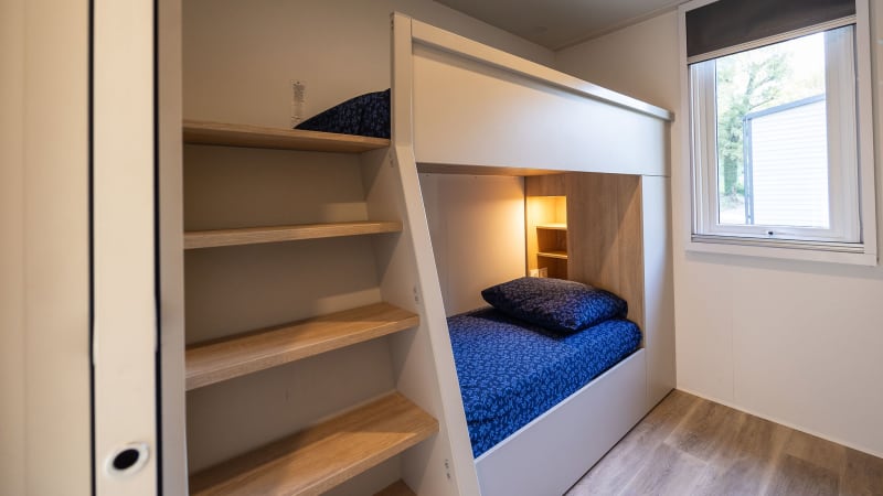 De mobil home heeft drie slaapkamers. Eén met een tweepersoonsboxspring (160 x 200), één met twee eenpersoonsbedden (80 x 190) en één met een stapelbed (80 x 190). Alle bedden zijn voorzien van kussens en eenpersoons dekbedden. Het bijzetten van een babybedje is alleen mogelijk door een ander bed weg te halen.
