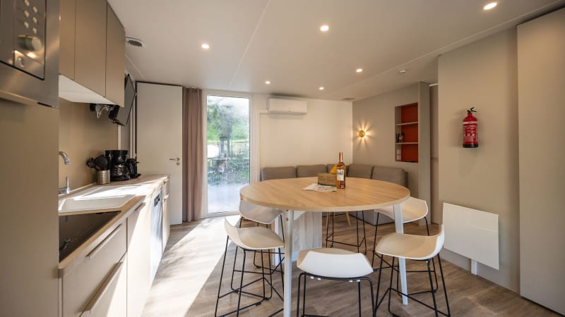 De mobil home heeft een ruime, luxe keuken met een uitgebreide inventaris, grote koelkast met vriesvak, 4-pits kookplaat, filter koffiezetapparaat, Nespresso apparaat, waterkoker, combimagnetron en een vaatwasser.